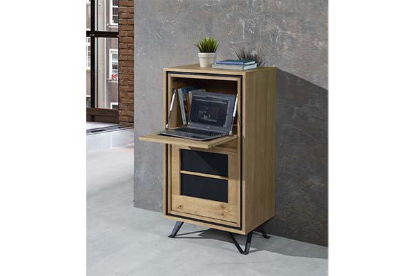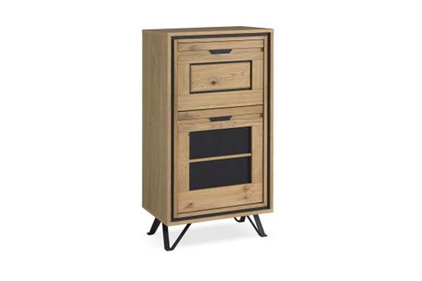 Le bois est proposé dans un ton brut brossé : on conserve une sensation authentique, un côté matière, une présence chaleureuse. Et ce bois dialogue avec le métal, présent notamment sur les pieds et sur les détails de façade. Le métal est gris anthracite, une teinte contemporaine, facile à associer, qui ancre le meuble et lui donne ce petit supplément de caractère.